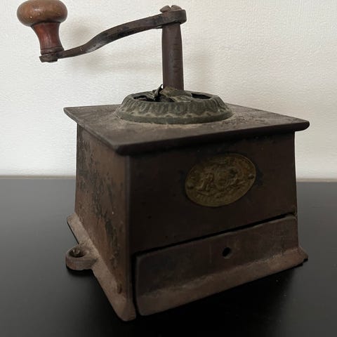 Manuell kaffekvern i tre og metall. Kvernen har en firkantet trekasse med skuff i front for oppsamling av kvernet kaffe. På toppen er det en metalltrakt og en sveiv i metall med trehåndtak. Egner seg til manuell maling av kaffebønner og som bruksgjenstand eller innredningsdetalj på kjøkkenet.