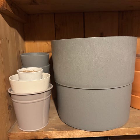 Sett med blomsterpotter i keramikk. Bildene viser tre enkle hvite potter med glatt overflate og én hvit potte med strukturert utside og metallisk innside. I tillegg følger det med en rund potte med blomstermønster i mørk farge på lys bakgrunn. Pottene egner seg til innendørs bruk til ulike typer planter og dekor.