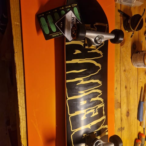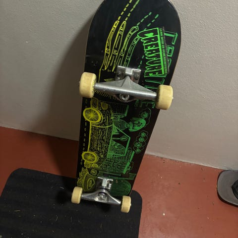 Komplett Creature skateboard med grafisk design i grønn- og gulfarger på svart bakgrunn. Brettet har standard dobbelkick-form med konkav, og er utstyrt med metalltrucker, lyse hjul og svart griptape på oversiden. Standard størrelse.