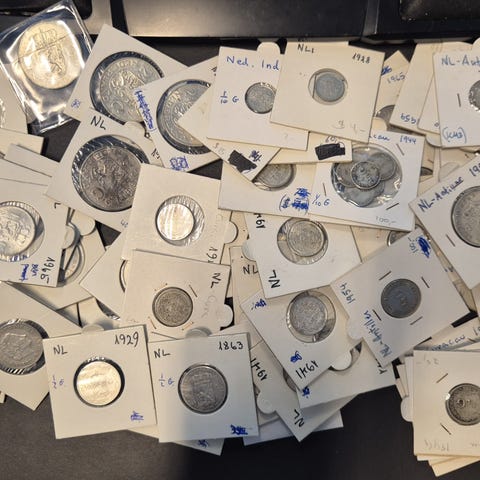 Selger en stor blandingslot med nederlandske mynter fra ca. 1900–1970-tallet.