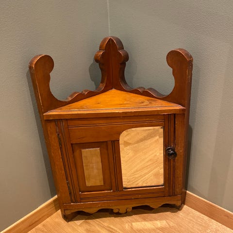 Skap i heltre med én dør i brun utførelse. Møbelet har sekskantet topp og klassisk profilert front. Innvendig er det én hylle som gir to oppbevaringsnivåer. Skapet står på lav sokkel og har metallring som håndtak på døren. Egner seg som lite oppbevaringsskap, nattbord eller sidebord i stue, gang eller soverom.
