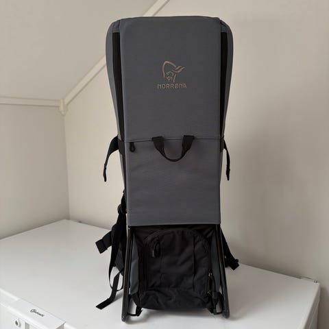Norrøna bæremeis for barn i grå farge. Bæremeisen har polstret rygg og sete for barnet, samt justerbare skulderstropper og hoftebelte for den som bærer. Egnet til turer og hverdagsbruk der barnet kan sitte trygt og komfortabelt på ryggen til den voksne.