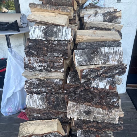 Ved i sekker av bjørk treslag. Vedkubbene er kappet og kløyvd, og pakket i nettingsekker for enkel håndtering og lagring. Egner seg til bruk i vedovn, peis eller utepeis. 50 sekker, 90kr sekken.