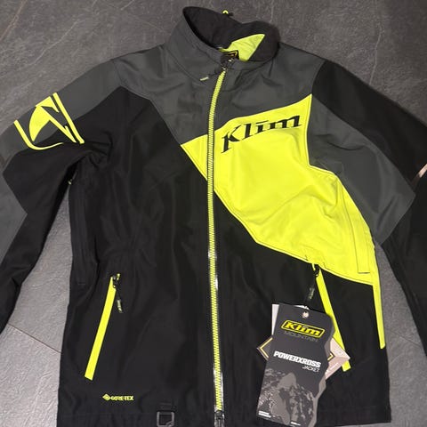Klim motorsykkeljakke og bukse i matchende sett. Plaggenes hovedfarge er lys blå/grønn med grå og brune felt samt gule glidelåser og detaljer.