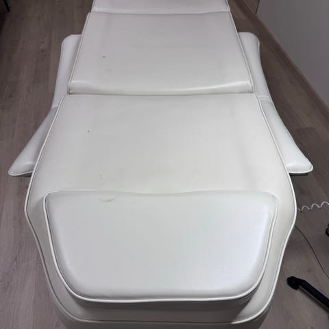 Elektrisk behandlingsbenk i hvit polstret utførelse. Benken har flere regulerbare seksjoner, inkludert justerbar ryggdel, ben-/fotdel og sidearmlener. Det er ansiktsåpning i hodeenden og medfølgende pute. Høyden kan justeres elektrisk via håndkontroll. Stabil base med hjul for enklere forflytning. Egnet som behandlingsbenk eller massasjebenk i klinikk, fysioterapi, velvære eller lignende bruk.