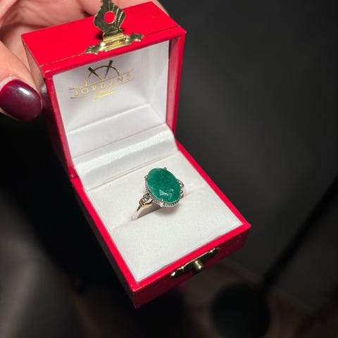 Grønn stein i metal ring. Steinen er ekte, men usikker på navnet. Kostet en del da jeg kjøpte.