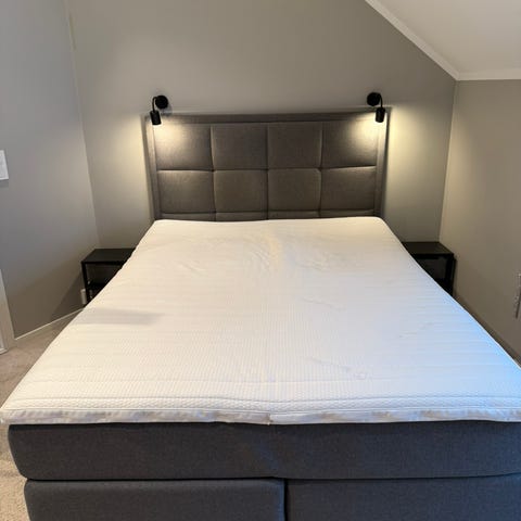 Sengen har høy sengegavl og fotende, samt rette linjer og moderne uttrykk. Den står på ben i tre. Overflaten på gavlen har noen synlige merker og slitasje, som vist på bildene.