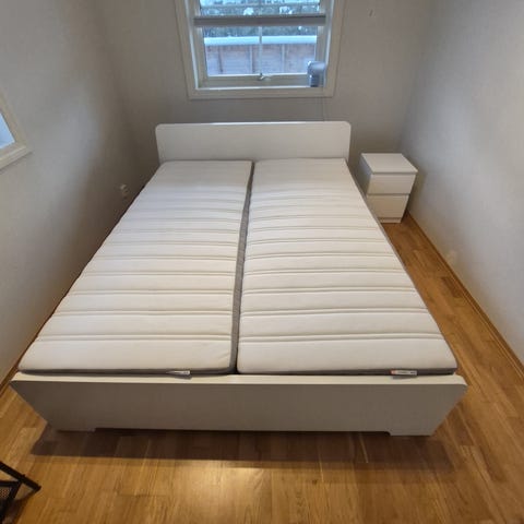 Dobbeltseng i offwhite farget skinn med madrass. Ukjent merke/leverandør.