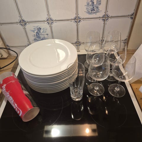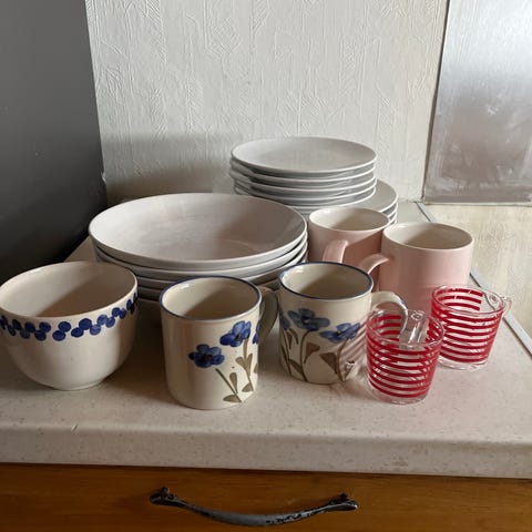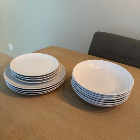 5 middagsasjetter, 6 frokostasjetter, 4 tefat, 6 glass, 3 krus, 4 vinglass og 2 bestikkbeholdere gis bort enten samlet eller delt.
