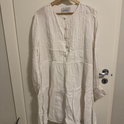 Neo Noir Florence sommerkjole for dame i størrelse 42. Kjolen er hvit og laget i polyester. Modellen har lange ermer, knappelukking foran og dekorative knapper ved mansjettene. Stoffet har brodert struktur og hullmønster som gir et lett og luftig uttrykk. Passer som sommerkjole til hverdagsbruk eller enkle anledninger. Oppbevart røykfritt
