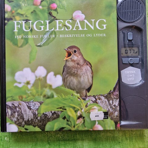 Cappelen Damm Fuglesang bok med lydmodul hilvsalgs 300 kr.Boken beskriver 150 norske fugler med tekst og fotografier, og har innebygd elektronisk lydmodul som spiller av fuglesang. Egnet som oppslagsverk og hjelpemiddel for å lære å kjenne igjen norske fuglearter og deres lyder. Boken er innbundet og utgitt på norsk.