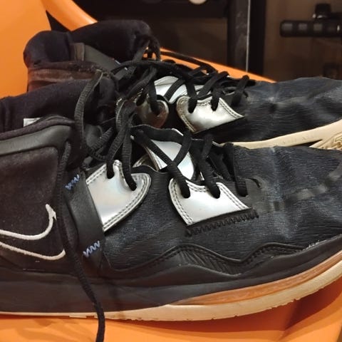 Nike Vapor basketballsko i svart og hvit farge. Skoene har snøring og mellomhøy profil rundt ankelen. Overdelen er i tekstil og syntetisk materiale med stor Nike-logo på siden. Yttersålen er i gummi for grep på innendørs underlag. Egnet som basketsko/håndballsko eller til hverdagsbruk. Størrelsesinformasjon fremgår av merkelappen på innsiden av skoen.