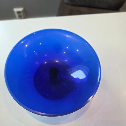 Dekorativ blå kunstglass skål med flott dybde i glasset.