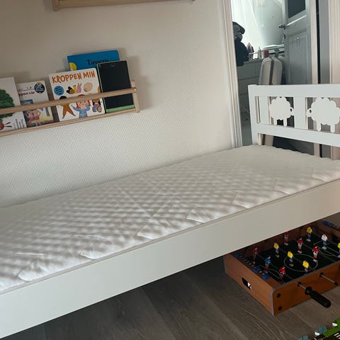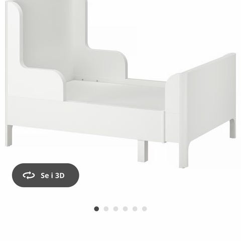 IKEA juniorseng i hvit utførelse. Sengen er tilpasset barn som har vokst ut av sprinkelseng og gir en lav og trygg liggehøyde. Passer til standard madrass for juniorseng. Nøytral farge gjør at sengen kan kombineres med ulik innredning på barnerommet.