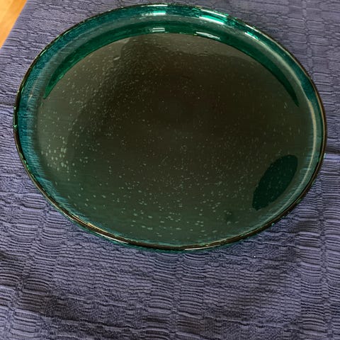 Hadeland Glassverk glassfat i grønnfarget glass. Settet består av tre runde fat i ulike størrelser. Fatene har en jevn, glatt overflate med små luftbobler i glasset som dekorativ detalj. Egner seg til servering eller som dekorative fat på bord eller benk.