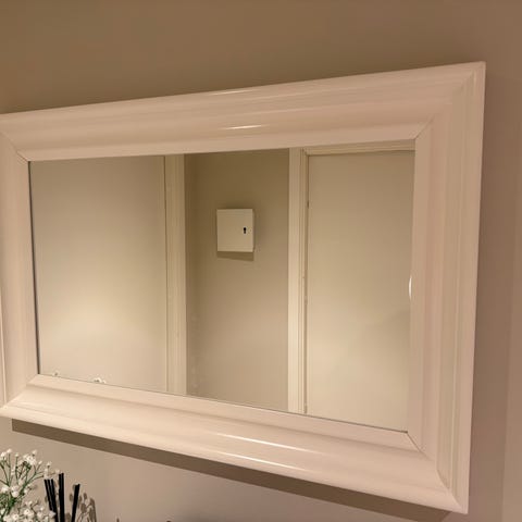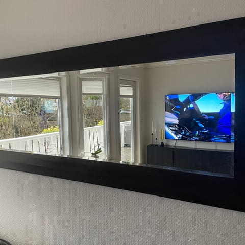 IKEA speil med rektangulær form og bred hvit ramme. Speilet er vegghengt og egner seg godt over sofa, skjenk eller kommode. Kan henges opp både stående og liggende.