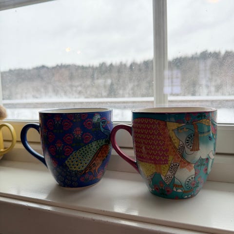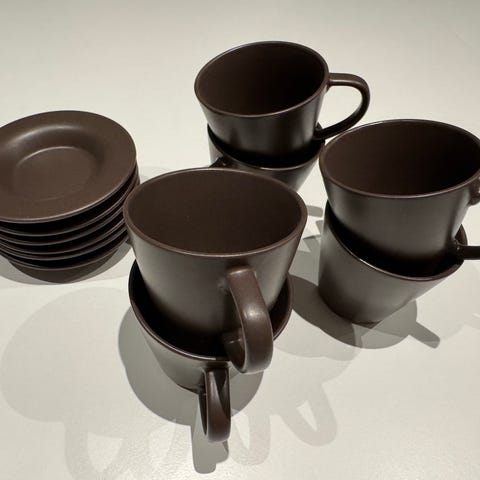 Iittala Teema kaffekopper med skål i svart porselen. Settet består av fire kopper med hank og én tilhørende skål. Tre mindre kopper og en større - se bilder for mål. Eldre utgave.