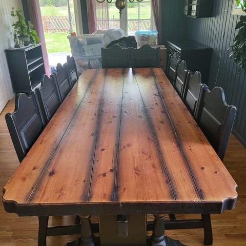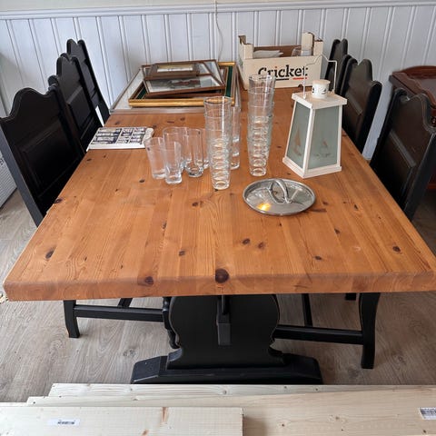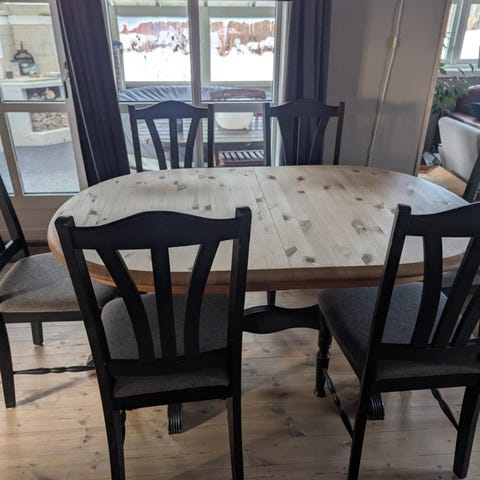 Robust, rustikk, heltre spisestue. Bord 2x1 meter m/6 stoler