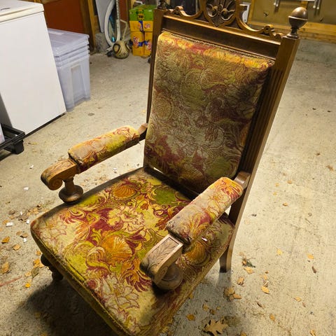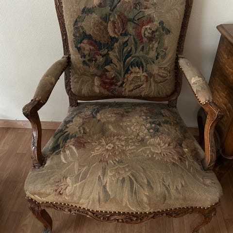 Velholdt kongestol med fotskammel selges. Trolig fra 1930 tallet.