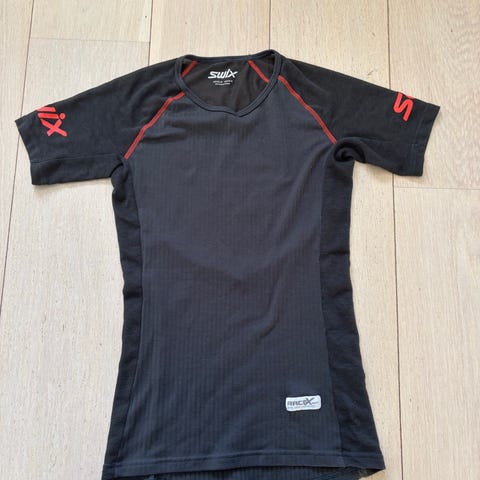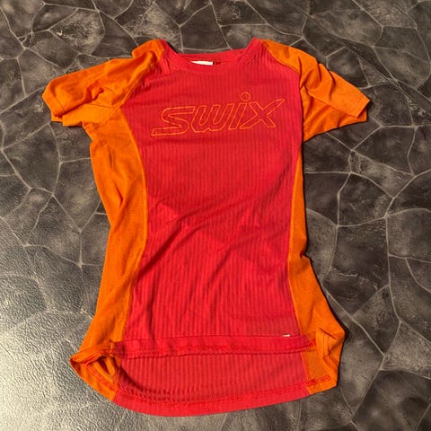 Swix treningstrøye for løping til dame i størrelse M. Kortermet modell i rødt med hvite logodetaljer på ermer og rygg. Liten i størrelse. Syns det er mer som en str s