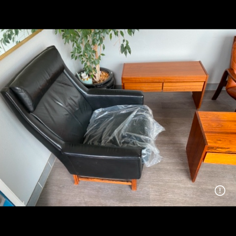 Vurderer å selge én av mine to stoler av modell Stuart av Torbjørn Afdal for Nesjestranda Møbelfabrikk. Utrolig flott håndverk i form av flotte sammenføyninger, og de karakteristiske armlenene som sees på flere av Afdal sine modeller. Heltre teak og sort skinn. Uoriginal formsydd sittepute i gult stoff kan også medfølge om interessant.