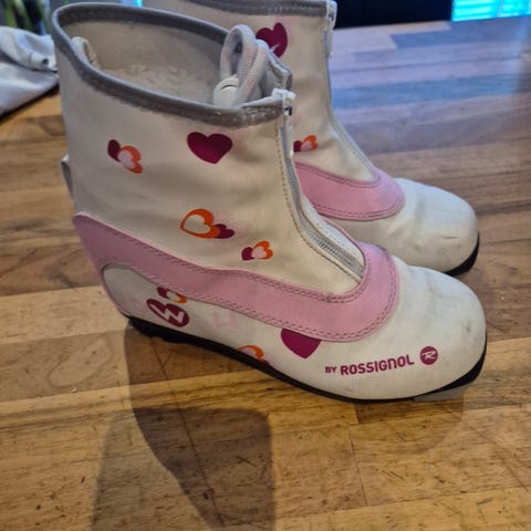 Rossignol langrennsstøvler for barn i hvit og rosa farge. Støvlene har glidelåslukking foran og innvendig snøring for bedre tilpasning rundt foten. Overdelen er i syntetisk materiale med trykte hjerter, og innsiden er polstret for økt komfort og varme. Sålen er i svart plast/gummi med feste for langrennsbinding. Egnet til bruk på langrennsturer for barn.