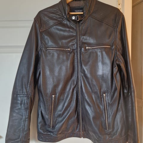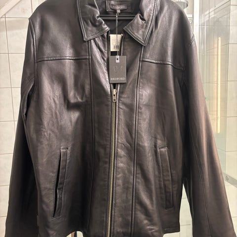 Redford Diego skinnjakke for herre i størrelse XL. Omkrets bryst er 124 cm, livvidde 118 cm. Jakken er mørk brun og laget av 100 % lammeskinn. Fôret består av 100 % bomull i kroppen og 100 % polyester i ermene. Modellen har glidelåslukking foran, ståkrage med knapp og flere glidelåslommer. Pent og lite brukt uten flekker eller skader.