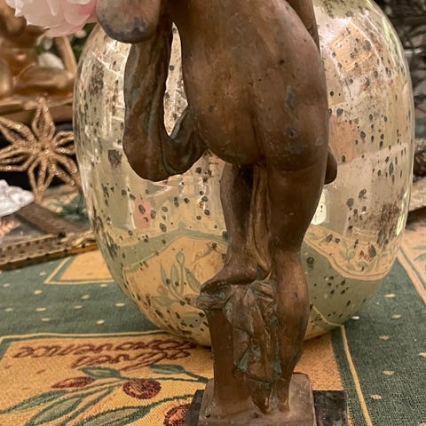 Dekorativ, akt figur av sittende kvinne i mørk brun farge med grå grønn sjatteringer. Figuren forestiller en naken kvinne som sitter på en stein lignende base med den ene armen løftet mot hodet. Skulpturen har glatt overflate og klassiske, myke linjer. Passer som interiørdekor på hylle, kommode eller bord. Materialet fremstår som støpt kompositt med mørk brun og grønn patinert finish.