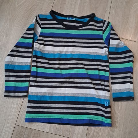 Polarn O. Pyret genser for barn i størrelse 122/128. Genseren er unisex og laget i bomull. Den har flerfargede striper og lange ermer, med rund hals. Passer til hverdagsbruk for barn i alderen rundt 6–8 år, avhengig av høyde og passform.