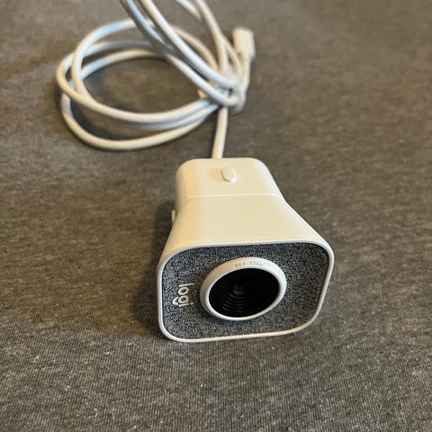 Logitech StreamCam webkamera med USB‑C. Selges billig pga støver ned i en skuff. Kommer med to fester, det ene for stativ med skrue.