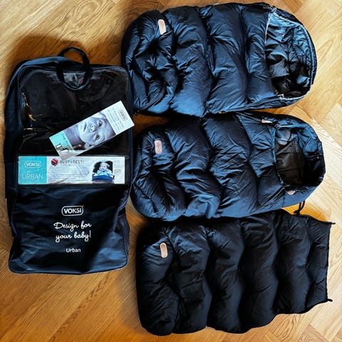 Voksi Urban vognpose i blå farge. Vognposen har myk og varm polstring, og innside i mørkt stoff. Den har flere åpninger for seler, slik at den kan brukes i barnevogn med ulike selesystemer. Glidelåser langs sidene gjør det mulig å åpne posen helt opp og tilpasse temperatur.