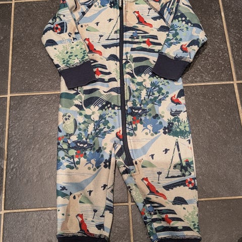 Fin tynn vann og vindtett sommer høst og vårdress. Brukt en høst av ett barn, så her er det mye dress igjen. Kommer med hette og gummistrikker i god stand. Kan justeres i midjen på innsiden.
