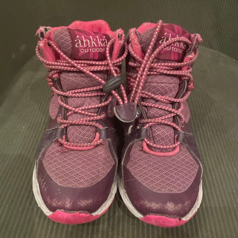 Pent brukt tursko for jente i størrelse 36. Støvlene er i hovedsak grå med rosa og svarte detaljer, samt lys innside. Overdelen er i syntetisk materiale og tekstil med forsterkninger på tå og hæl. Sålen er grovmønstret for godt grep på glatt underlag. Modellen har snøring foran og middels høyt skaft som gir støtte rundt ankelen. Egnet som tursko for barn i kaldere og vått vær.