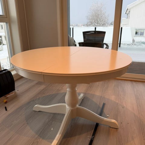 Hvit spisebord med ekstra fast ileggsplate skjult under bordplaten