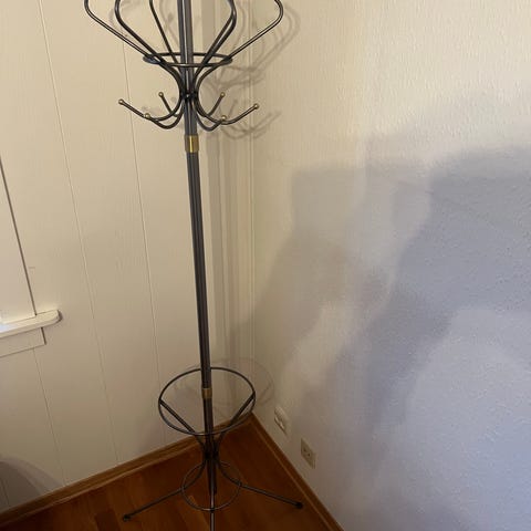 Frittstående klesstativ i metall. Stativet har flere kroker øverst for oppheng av jakker, kåper eller vesker, samt ekstra kroker på midten for kortere plagg eller tilbehør. Passer i gang, entre eller soverom for organisering av yttertøy og klær.