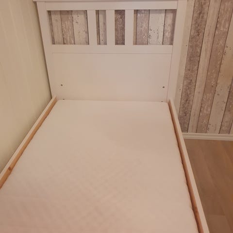 Norsk produsert dobbeltseng, størrelse 150 x 200, inkluderer sidevanger og bunn. Hvitmalt med syrebeiset innslag i rygg/fotgavel. Skruer for montering medfølger.