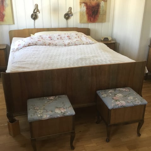 Seng i treverk med matchende nattbord og oppbevaringskiste. Møblene er hvitmalte med naturfarget treplate på nattbord og kiste. Sengegavlen har dekorative detaljer i tre. Nattbordene har skapdør og skuff for oppbevaring. Kisten har lokk som kan åpnes og delt innvendig rom for oppbevaring av sengetøy eller andre tekstiler. Madrasser følger med, som vist på bildene. Passer til soverom der man ønsker en helhetlig møbelserie i lys trestil.