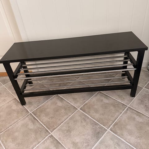Skobenk fra Jysk med plass til ca 8 par sko. Obs ene hyllen har mistet en skrue som gjør at døren ikke henger ordentlig, så må fikses. Selger derfor billig.