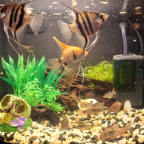 Luftsteiner, luftkoblinger, tilbakeslagsventiler, luftdrevne svampfiltere, lys, akvariumer fra 20L til 100L, akvariums bolle(kjent som gullfiskbolle men skal ikke brukes til gullfisk), kjemikalier, test sett ect.
