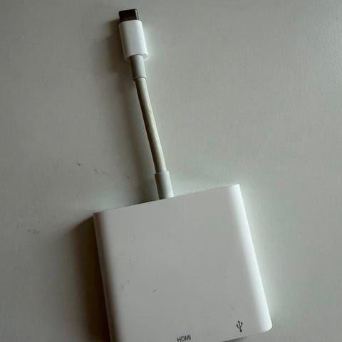 Original Apple adapter med Lightning tilkobling. Den fungerer greit til speiling av telefonen, men enkelte strømmetjenester støtter det ikke, eller jeg har i alle fall hatt problemer med det. Det kan være andre årsaker. Det anbefales å lese litt opp på det.