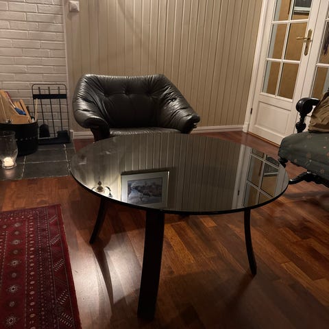 Massivt bord med glassplate, under del i smijern. Tror ikke det finnes maken til dette. 2 små hakk i bordplate, men ingen skarpe kanter