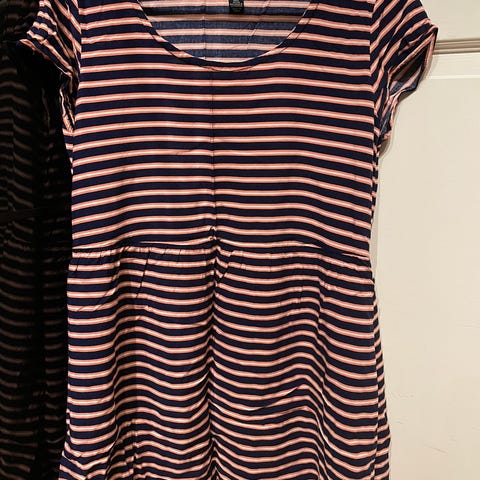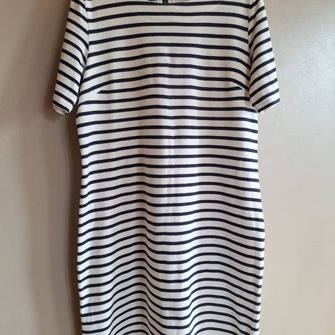 Jean Paul hverdagskjole for dame i størrelse L. Kjolen er i blått og hvitt stripemønster og er laget av bomull. Den har korte ermer og rund hals. Passer som hverdagskjole og kan brukes alene eller med strømpebukse eller leggings. Lengde og vidde fremgår av målebåndet på bildene.