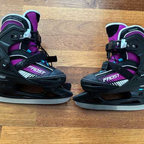 Frost spiller pro ishockeyskøyter for barn i størrelse 29 (EUR). Skøytene er justerbare i lengde og dekker ca. størrelse 29–32. Overdelen er laget i syntetisk materiale med polstret innside og fôr av 100 % polyester. Modellen har snøring kombinert med justerbare spenner for å gi god tilpasning rundt foten. Skøytene er beregnet for ishockey og generell skøytebruk på is for barn.