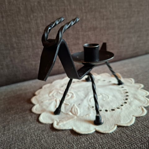 Selger denne superkoselige kattelysestaken. Plass til eit lite kubbelys eller kronelys ( om du tør..) Artig figur. Har gjort eit bildesøk og det KAN vere Ystad metall / Gunnar Ander? Nokre bruksmerker på lysestaken, men "i godt skikk"