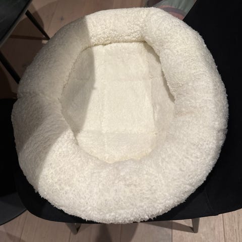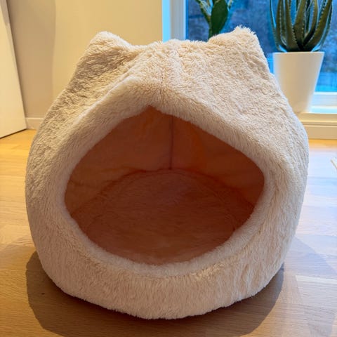 Fremstår veldig pent brukt på det synlige grå stoffet, men har fått noen kloremerker og hull i bunnstoffet under sofaen.