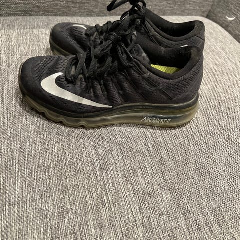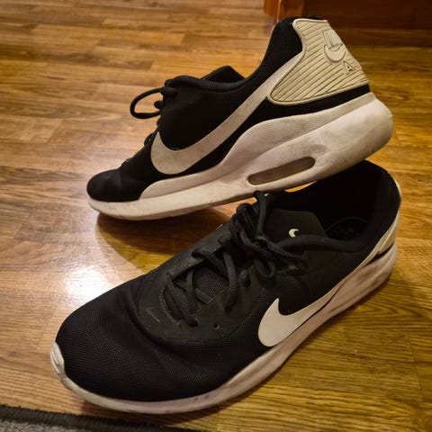 Nike Air løpesko i størrelse 44. Skoene er svart med hvit såle og hvit Nike-logo på sidene. Overdelen er i tekstil og syntetisk materiale, med snøring foran. Sålen har demping med Air-enhet i hælen. Egnet til løping og annen lett trening, samt hverdagsbruk.