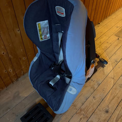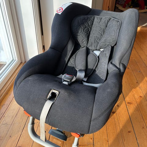 Bakovervendt beltefestet bilstol. Kan brukes lenge, opp til 25 kg. God lengde på rygg, justerbar høyde på skulderstropp.