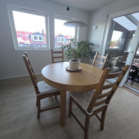 Klassisk rundt spisebord med 6 stoler – pent brukt