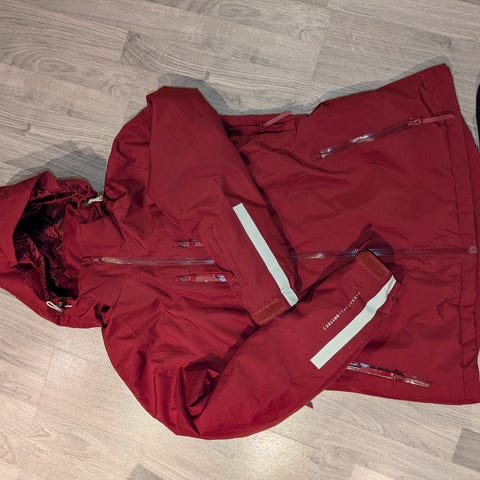 Vikafjell yttertøysett for dame i størrelse S. Sett med jakke og bukse i rødfarge. Materiale oppgitt som organza. Jakken har hette og glidelåslukking foran. Buksen har forsterkede felt i kontrastfarge på knær og bakside. Egnet som yttertøy til ulike utendørsaktiviteter. Litt limrester fra fuskepels på hetten