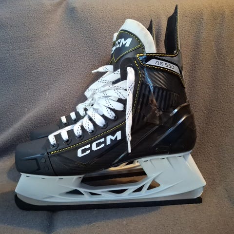 CCM Tacks AS 550 ishockeyskøyter i størrelse 45. Skøytene har svart overdel med hvite lisser og hvit holder. Modellen er beregnet for ishockey og gir god støtte rundt ankel og fot. Overdelen er i syntetisk materiale med forsterkninger i hæl og sidepartier. Såle og holder er i plast, med utskårne partier for lavere vekt. Passer til bruk på isbaner for trening og fritidsspill i ishockey.